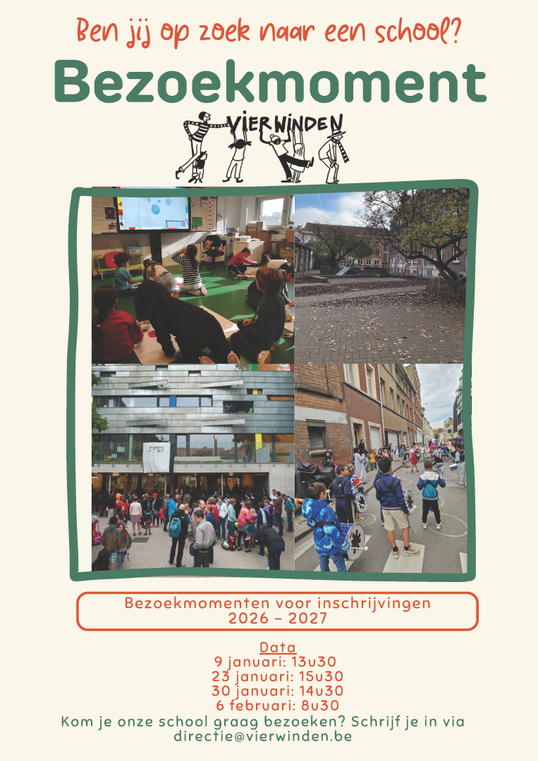 Welkom op de website van de Vier Winden Basisschool in Sint-Jans-Molenbeek. Naast deze website kan je ons ook volgen via onze gesloten Facebookgroep en Broekx (digitaal platform voor ouders - ook beschikbaar via een app).